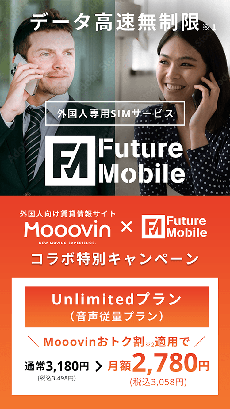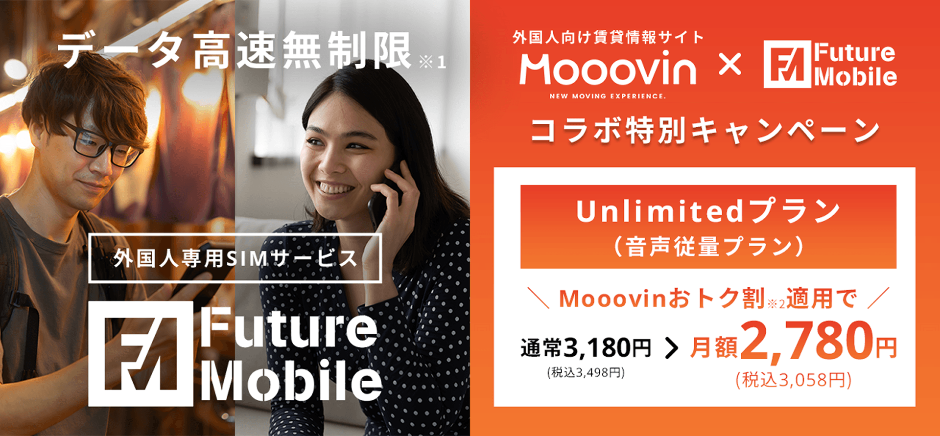 ※1 Mooovinおトク割適用後の料金。2024年11月自社調べ。※2 Mooovinにて賃貸契約、およびFutureMobile契約の双方サービスをご利用いただいた場合に税込み440円/月を割引。※3 混雑時など公平なサービス提供のため速度制御する場合あり。※4 海外への渡航前に日本でネットワークに必ず接続してください。 ※5 2GB超過後は最大128Kvbpsで使い放題となります。